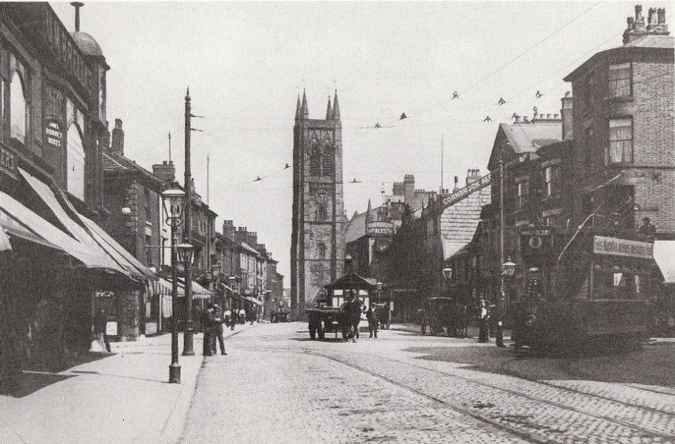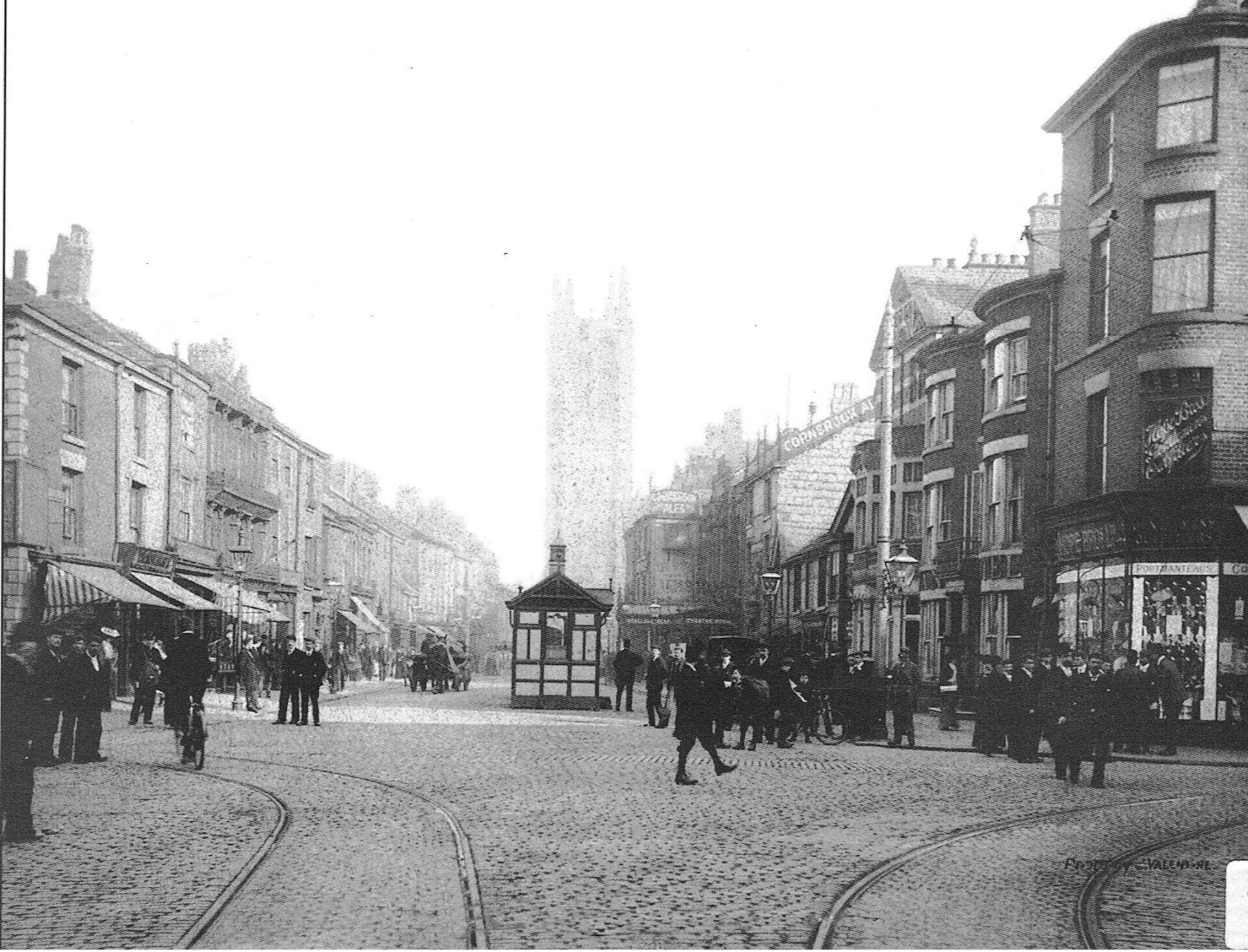 3. 1907 Churchgate, from the Swan Hotel corner towards the Parish Church, note the tram lines and the cabbies’ shelter which was removed around 1909. Theatre Royal canopy is visible. No market cross which was erected in 1909. Hope Bros shop occupies the corner.Across the corner window it says Portmanteaus. At this time the corner was known as Hope corner rather than the Swan corner or Preston’s corner. Note that there are no exposed beams and no real or fake half timbered effects on the buildings on the left. Note the fourth frontage along, with the sign board on the roof and what looks like a balcony, which will be mentioned later. There are a surprising number of people around, a large group formally dressed. Something is going on.