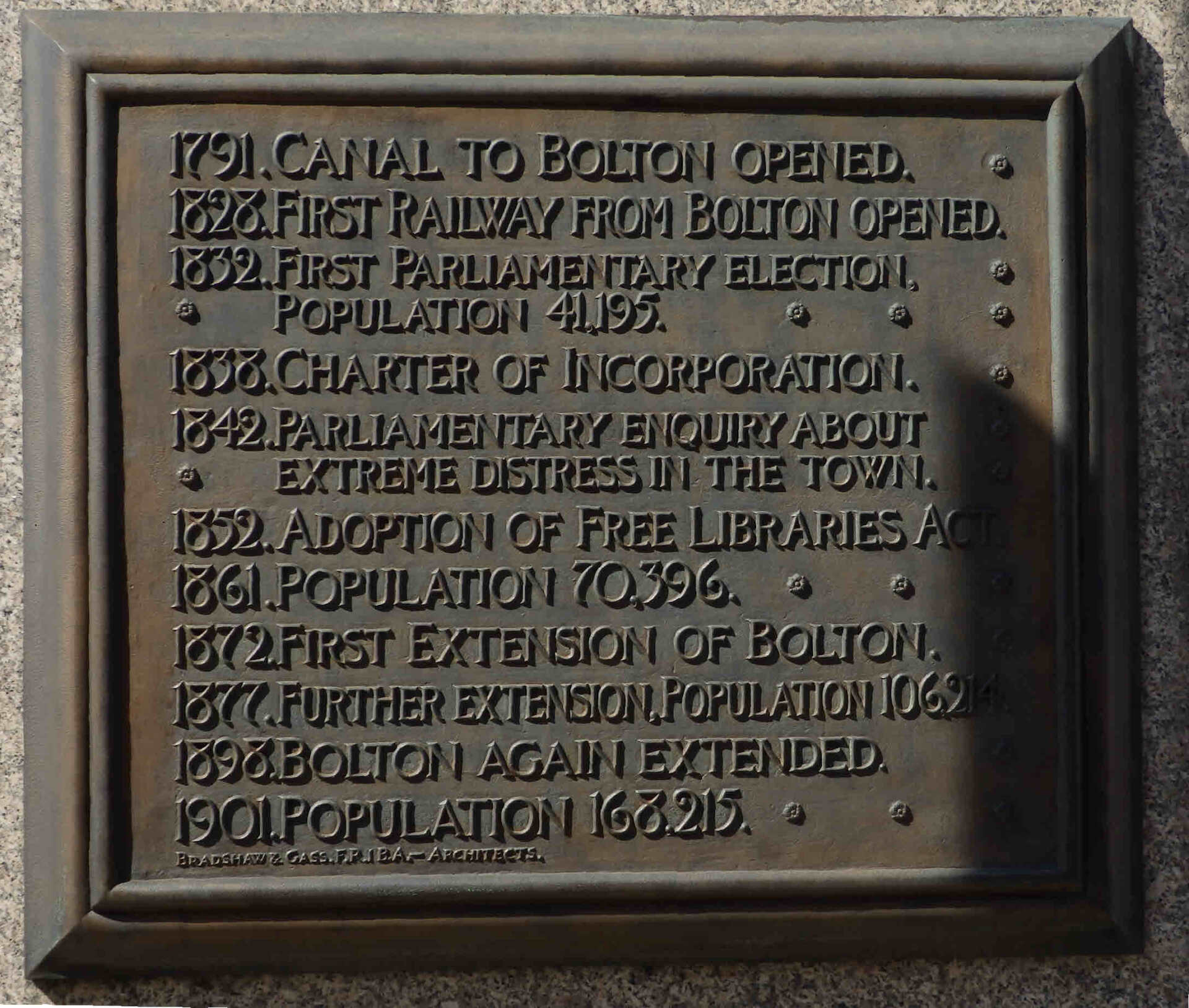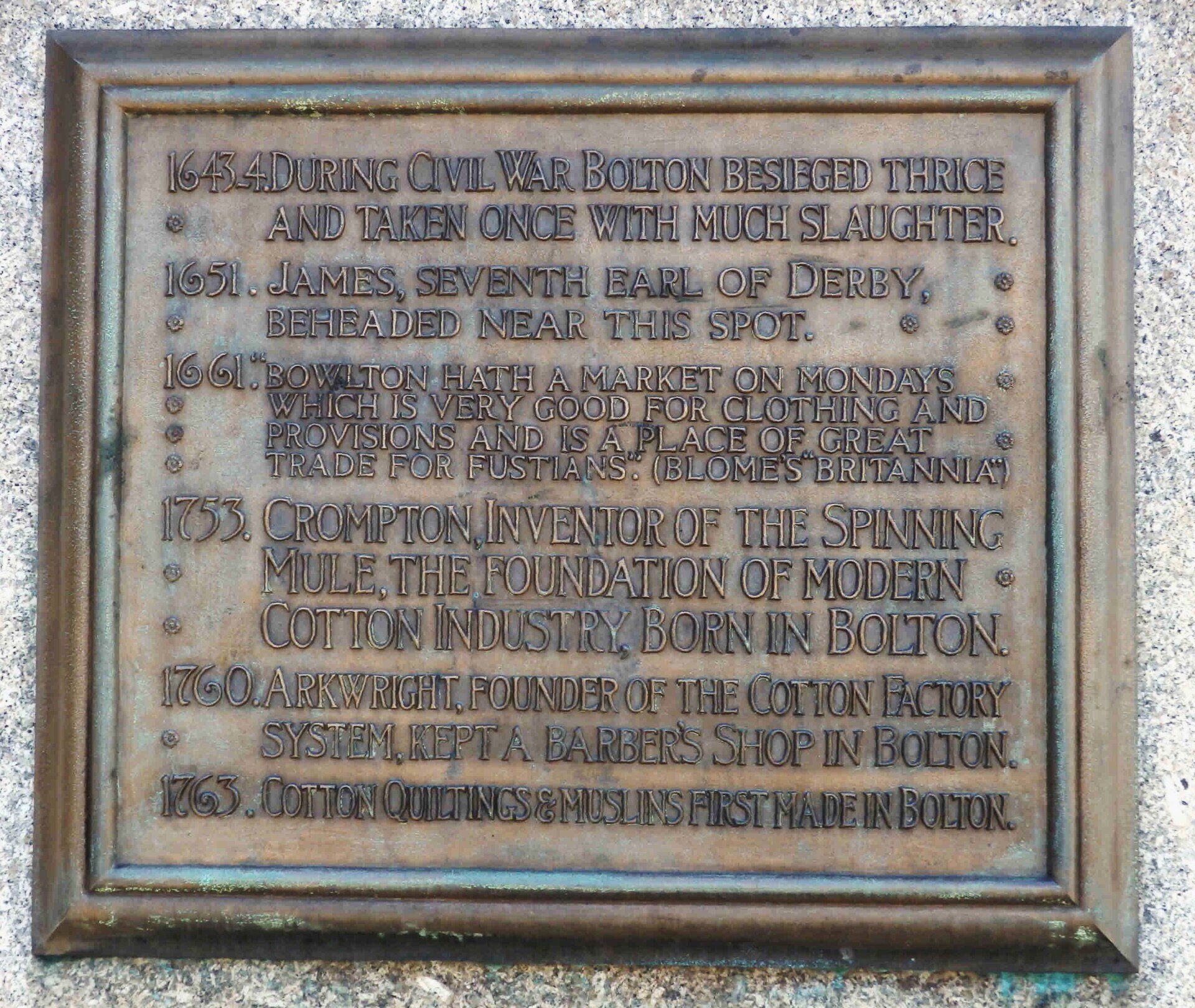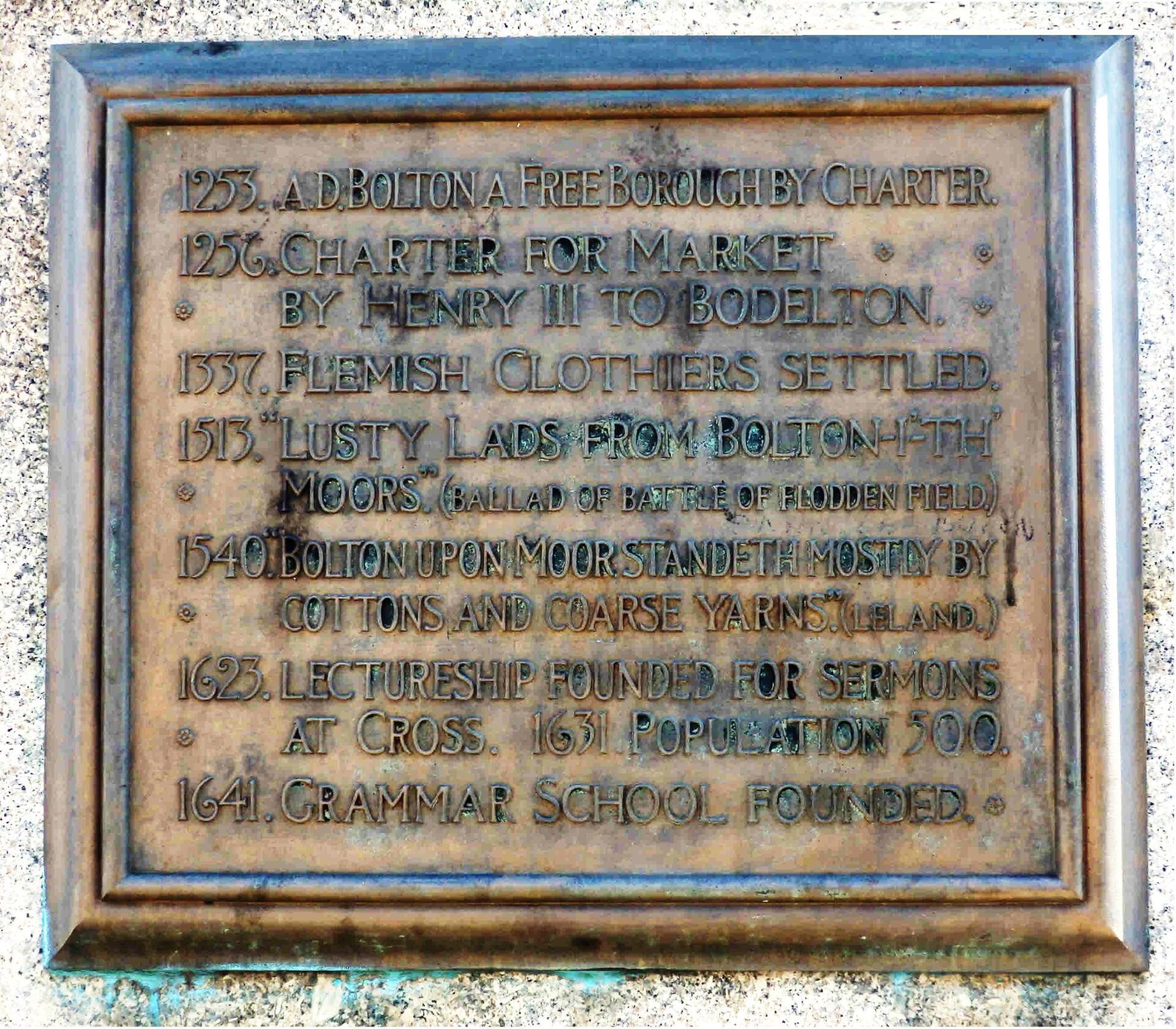 Plaques on the four sides of the Market Cross plinth give some details of the history of Bolton. The 1337 date and the actuality of the Flemish settlers is in considerable doubt. 1513 quotes "Lusty lads from Bolton i' th' Moors (Battle of Flodden Field)"This event is commemorated by the arrow on the Bolton Coat-of-Arms.