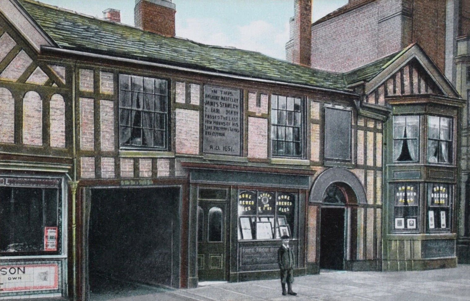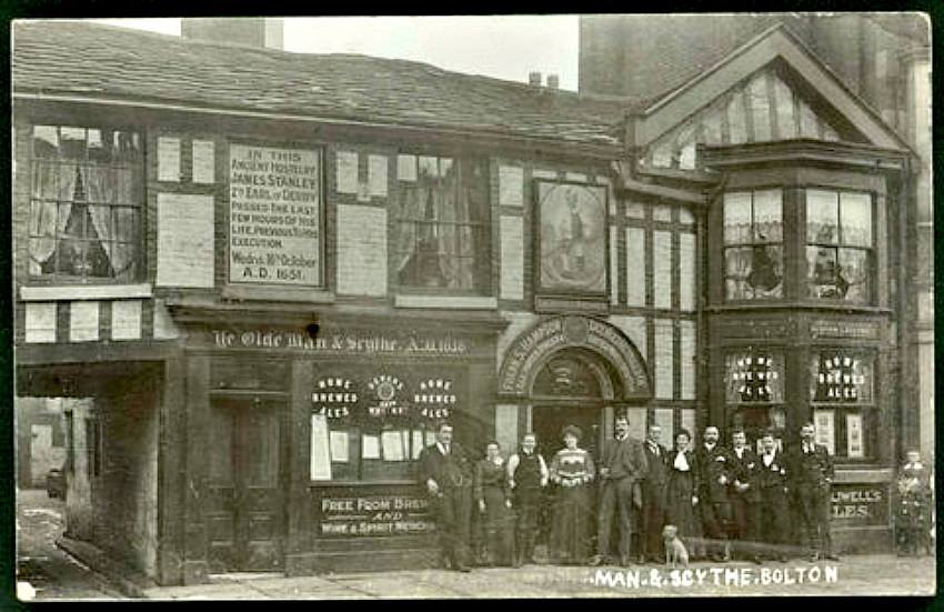 The Pilkingtons owned large tracts of land including Bolton from the early 1300s (that reference should probably be early 13th Century since Man and Scythe is mentioned in 1251) until 1497 (1485?) when the lands passed to the house of Stanley of which was James Stanley, 7th Earl of Derby infamously beheaded here in 1651. The Derby family recalled by Derby Street and Knowsley Street and others were Bolton landowners until modern times. It has been suggested that the Pilkingtons had a manor house on the site of the Man and Scythe. There were a number of branches of the Pilkington family including the glass makers of St Helens.