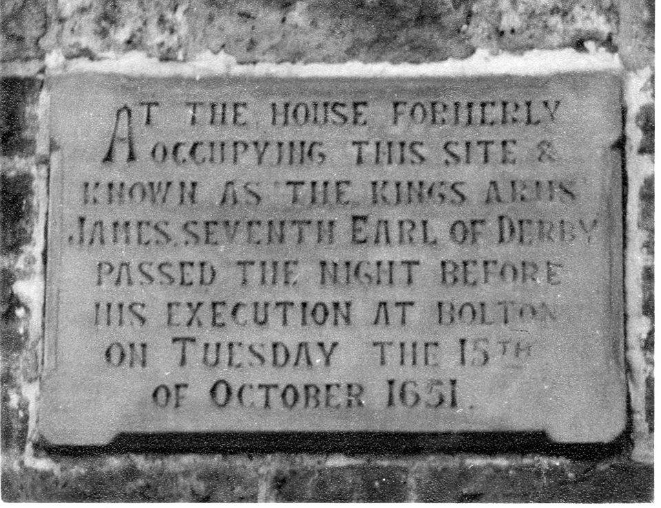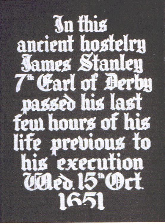 The notice originally said that The Earl of Derby spent his last three hours in this pub before being beheaded for being on the wrong side in the English civil war and for his part in the massacre, 28th May 1644, of possibly 1500 people after Bolton fell to the Royalists under Prince Rupert on the third attack. The Earl of Derby spoke from the scaffold and denied any part in the massacre. The notice was later amended to read "last FEW hours". It is sometimes believed that he spent his last night, 14-15 October 1651, here but that is not the case.
