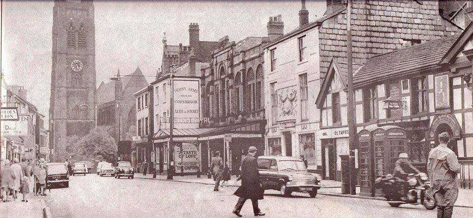The Parish Church is a feature of course, then returning on the right the Derby Arms which hosts the RAOB, the Theatre Royal, the Bush Hotel and the Old Man and Scythe.