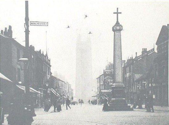 1 1905 posted on Facebook by Peter Lodge. On the left we have Umbrellas and the building that Preston's move into, then we see the quoins on the corner of Vose's. On the right we see a cabbie's hut, the near wall of the Derby Arms and the canopy of the Theatre Royal. We see the Old Man and Scythe but only because we know it is there; the Swan is clear enough The tram heading for Chorley New Road seems to have a full upper deck. Extreme right we have the fustian warehouse now housing shops. Above it appears to say CASH CLOTH