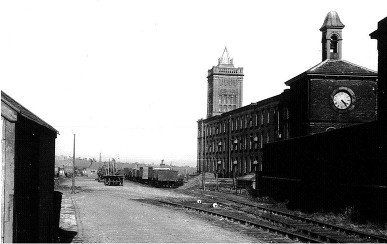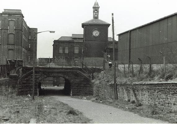 View of the eastern building of Sunnyside Mills looking down Adelaide Street. The original railway crossed Adelaide Street at this point which was the top end of the rope hauled incline. When the railway was rerouted in 1885 the original track was preserved as far as this point as a branch line to deliver coal and probably raw cotton to the mill. What appears to be one side of a bridge is an elevation of the track preserving the level of 200 yards west and creating coal hoppers for the easy unloading of coal wagons. However the line did cross Adelaide Street on a bridge named Bolton Bridge, which seems odd in that it increased the height of the "incline" though it removed the need for a level crossing. Notice the "continuation school" at the left of the picture. The gate house was just below this.