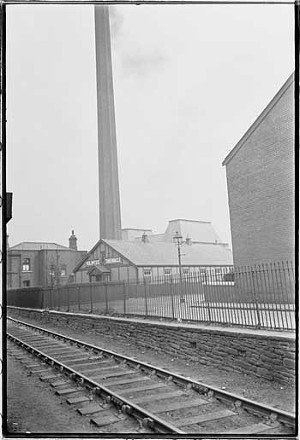 The immense west-most chimney of the site behind the Holiness Tabernacle with the 1828 railway at the front of the picture, the level crossing being just off shot to the right. (C)Bolton archives - worktown collection 1937 (?)