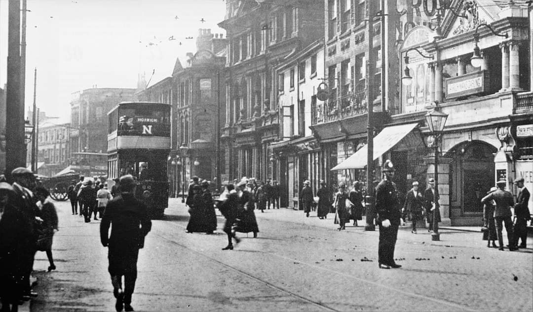 Electric trams, horse and cart, man enquiring of the policeman (or is it two bobbies having a confab?), The Upper Nag’s Head, closed in 1929 is still there and the 1930-32 building on the corner of Knowsley street has not commenced building. Burton’s is not yet there. Picture probably c1920.