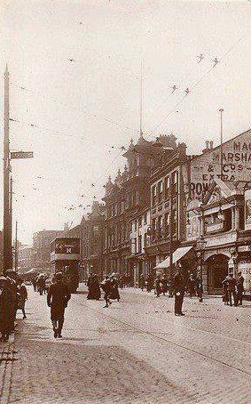 is on the right but the cathedral-like building on the corner of Market Street has not yet been built. This is before electric trams so is between 1875 and 1900. Magees closed it in 1929 after rebuilding the Lower Nag’s Head in 1927.