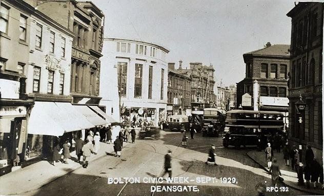 On the left we have the empty space waiting for Bolton's splendid GPO to be built so this picture is a little before 1913. Then beyond King Street we have the handsome and sturdy building which at some time had Apollo House written on its opposite end and which has Whittaker's shoe shop near its middle.