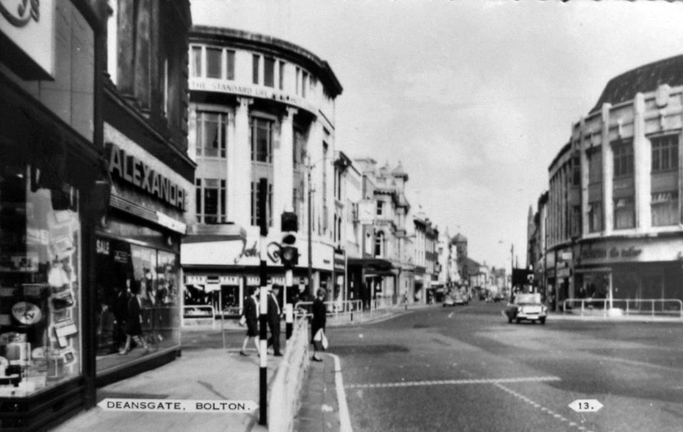 Deansgate looking east to the corner of Knowsley Street –Alexandre’s on near corner, Fifty(?) Shilling Tailor on far corner with Liverpool Victoria and Cooperative Insurance in the building.