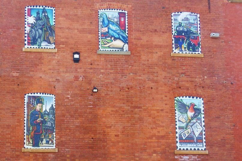 The Greyhound pub and some "street art". The block to its right as far as the GPO is now a car park..