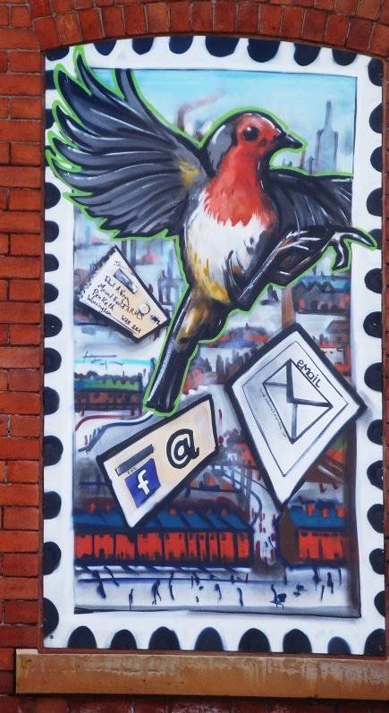 (C)WDC July 2021 A view of the rear of the GPO building as the redevelopment into apartments is almost complete. These murals reflecting both Bolton and the building's postal origin, by Kelzo (Tony Brady) and Entise (Evan Barlow) were unveiled 12 June 2021