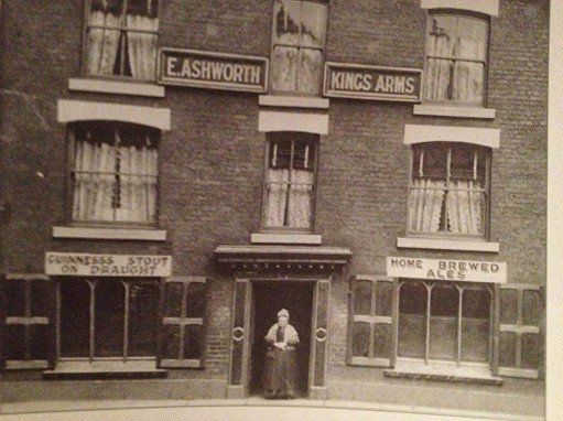 1 King’s Arms 86 Deansgate with Elizabeth Ashworth, the licensee of the King's Arms, pictured c1900.