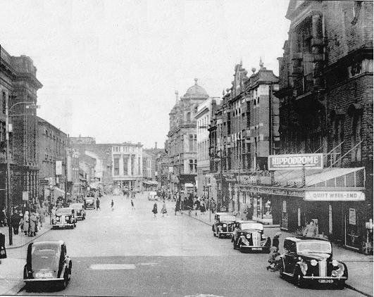 The YMCA building to the left, we can see the boys' department side entrance, and the Hippodrome to the right.