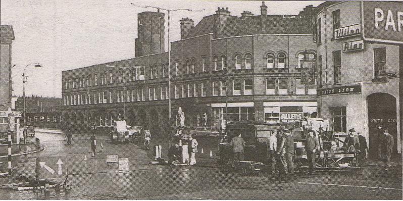 2 1964 Traffic lights almost ready and some resurfacing being done. On the corner is the White Lion Hotel from which White Lion Brow opposite gets its name. For some years up to about 2016 the building housed a sports wear wholesaler. At the moment (2018) it is occupied by a firm of solicitors.
