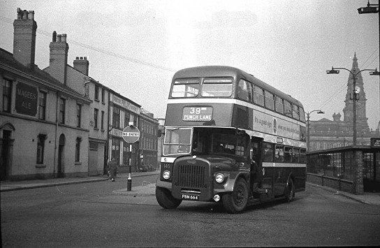 Great Moor Street looking west, the tower of Magees Crown Brewery and the roof of the Daubhill Congregational church are on the skyline. Blackhorse Street crosses GMS in the foreground with the George on the right and what was later Scholey’s wood shop on the left. The William Younger’s advert is on the corner of Ormrod Street, across from the Labour Exchange. Hargreaves House flats are to the left of the bus.