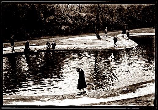 We seem to have a girl walking on her own while her brothers sail their boats.