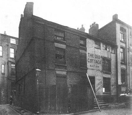The black and white picture from 1895 is taken from close to the river, almost at the bottom of the lane on the coloured picture, looking back up towards Ridgway Gate and Deansgate.