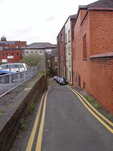 (5) More recently, as we go down Ridgway Gate, behind Poundstretcher we find the Victoria Hall on the right and a car park on the left. This narrow little lane goes down to the River Croal. The buildings seen at the end of this lane are actually on the other side of the river. (C)WDC May 2013